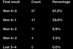 4-0获胜 | 97次 | 占比61.0%