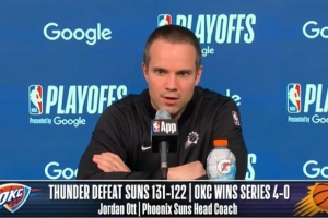 体育资讯4月28日讯 今日NBA季后赛首轮,太阳122-131不敌雷霆,0-4遭淘汰。赛后,太阳主帅奥特接受了媒体采访,以下为完整版采访内容。