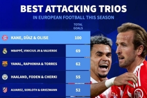 本赛季三叉戟进球榜:拜仁100球断崖领跑,皇萨城竞列前五