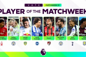 体育资讯4月23日讯 今天,英超联赛在官网公布了2025/26赛季英超第33轮最佳球员候选,哈兰德、B席、沃特金斯等8位球员在列。