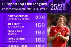 本赛季英格兰球员五大联赛赢得球权榜:安德森断崖领先,赖斯第三